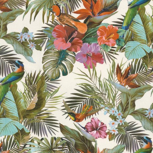 Elegáns,  trópusi mintás tapéta színes egzotikus madarakkal, virágokkal