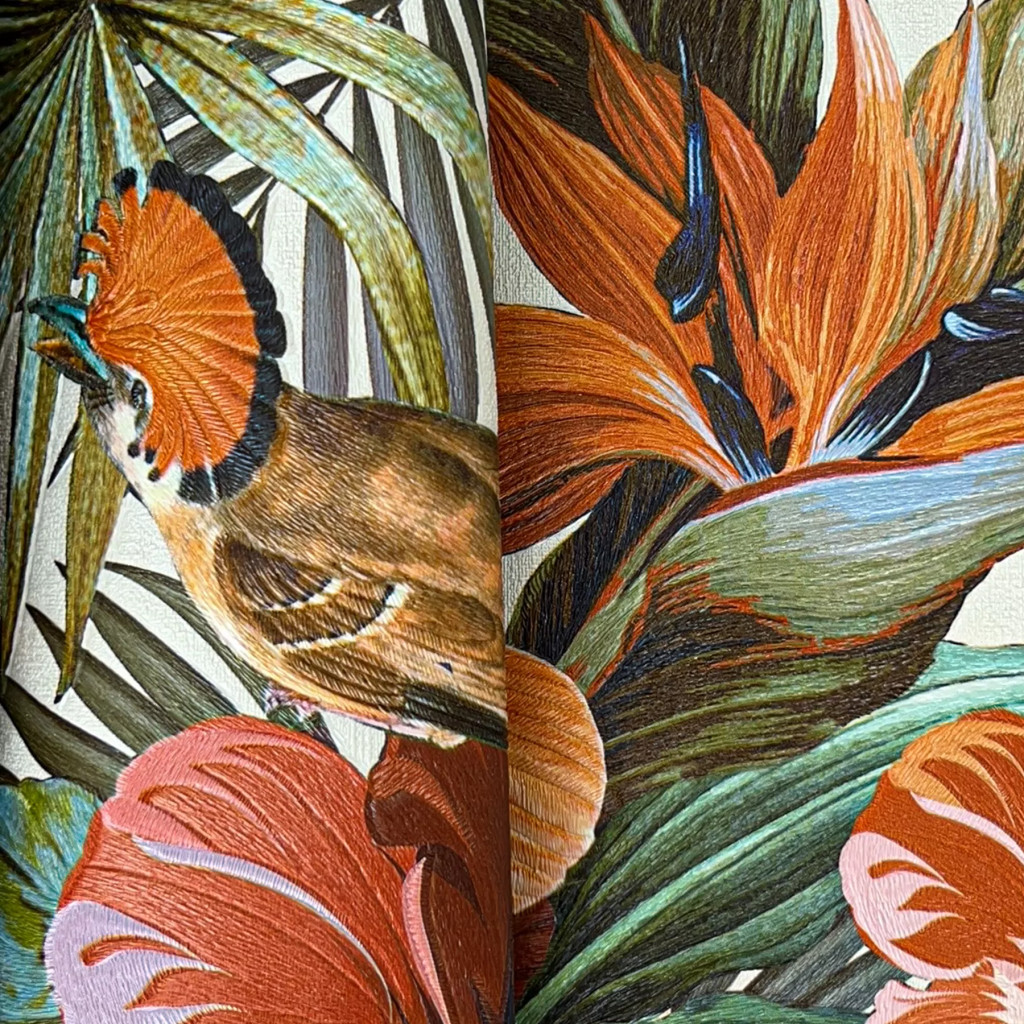 Ez a különleges, trópusi hangulatú tapéta azonnal luxus és karakteres megjelenést kölcsönöz bármely enteriőrnek. A mély, sötét háttéren megjelenő élénk színű egzotikus madarak, pálmalevelek és virágmotívumok elegáns kontrasztot alkotnak, így a fal valódi fókuszponttá válik.