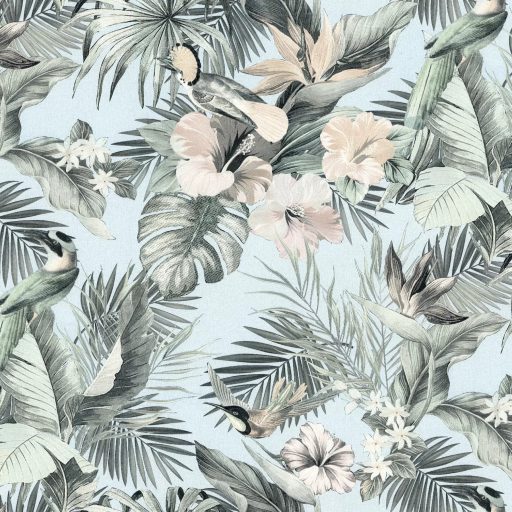 Elegáns, trópusi mintás tapéta színes egzotikus madarakkal, virágokkal