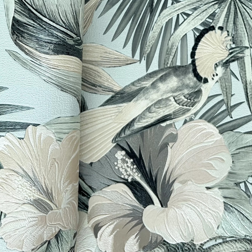 Ez a különleges, trópusi hangulatú tapéta azonnal luxus és karakteres megjelenést kölcsönöz bármely enteriőrnek. A mély, sötét háttéren megjelenő élénk színű egzotikus madarak, pálmalevelek és virágmotívumok elegáns kontrasztot alkotnak, így a fal valódi fókuszponttá válik.