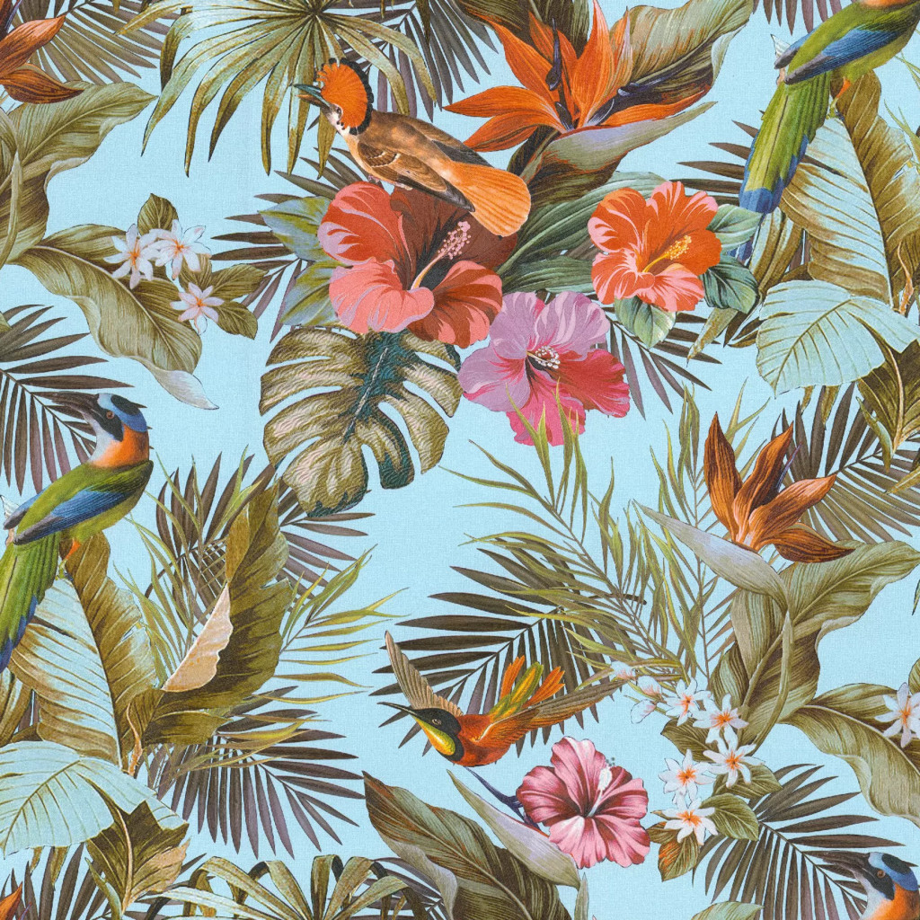 Elegáns, trópusi mintás tapéta színes egzotikus madarakkal, virágokkal