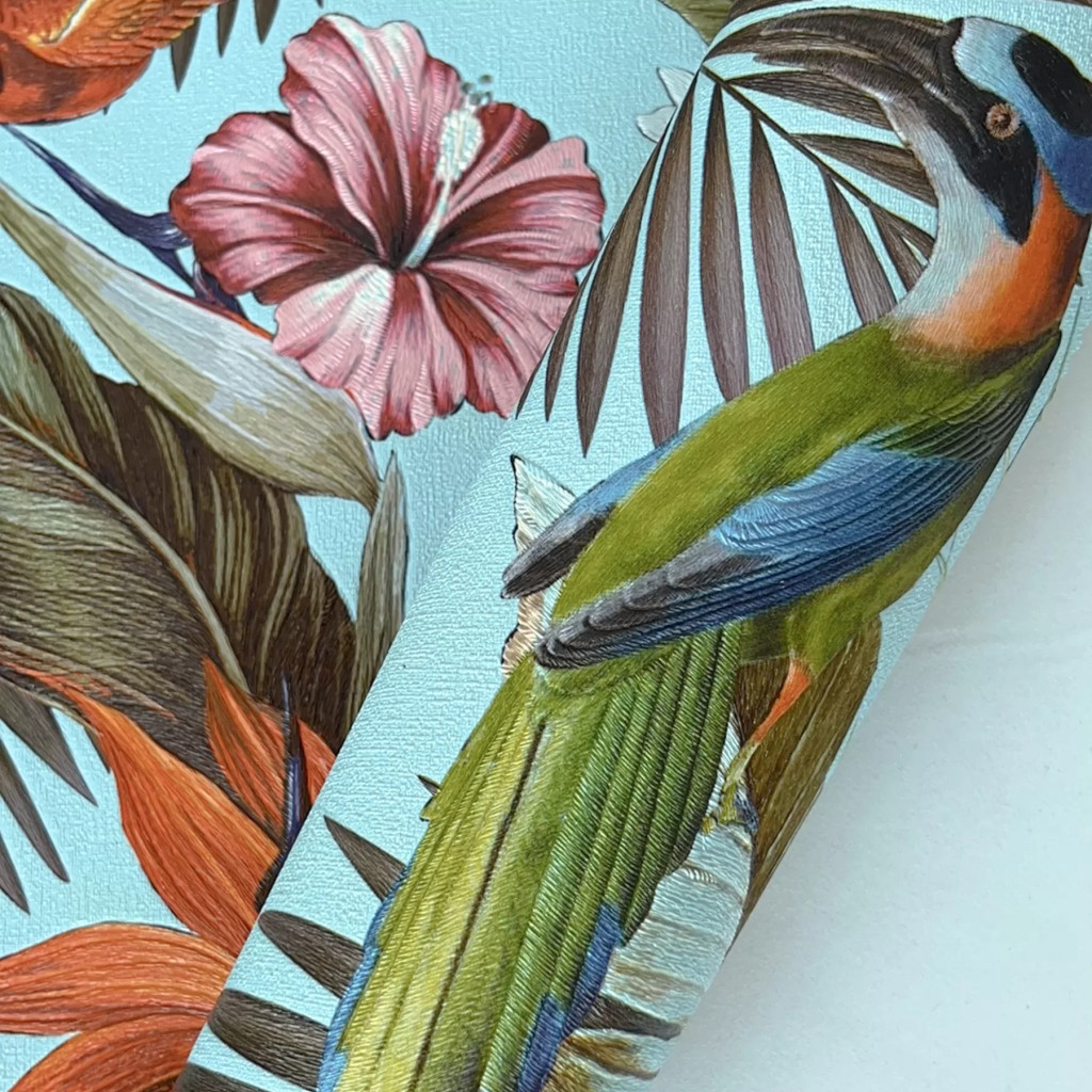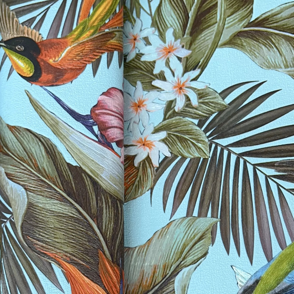 Elegáns,  trópusi mintás tapéta színes egzotikus madarakkal, virágokkal