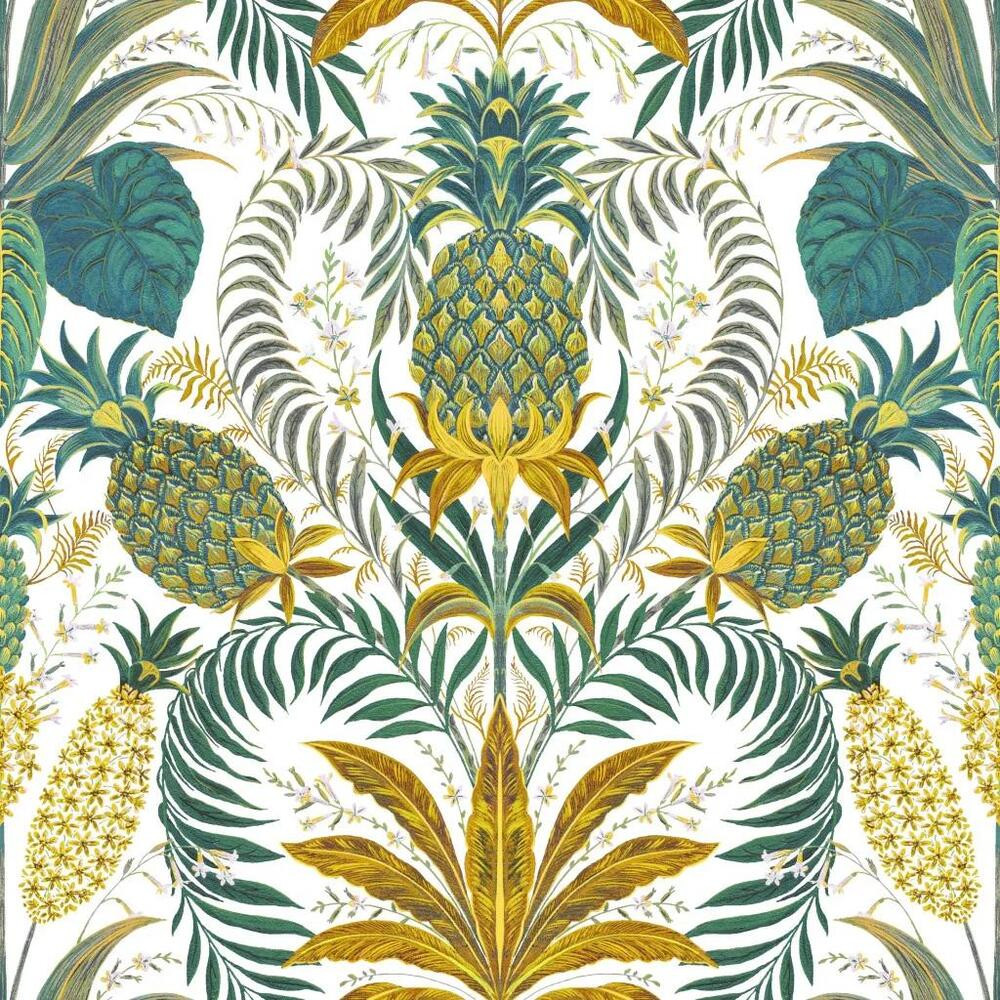 Látványos trópusi mintás tapéta ananász és botanikus növényi motívumokkal. Exkluzív faldekoráció, amely különleges és egzotikus hangulatot teremt nappaliban, étkezőben vagy hálószobában.