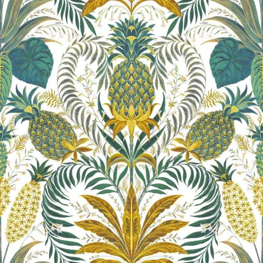 A trópusi ananász mintás tapéta különleges és dekoratív megjelenést biztosít a modern enteriőrökben. A részletgazdag botanikus minták, az ananász motívumok és a stilizált levelek egzotikus hangulatot teremtenek, miközben elegáns és karakteres faldekorációt biztosítanak.