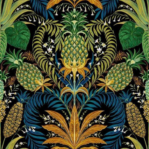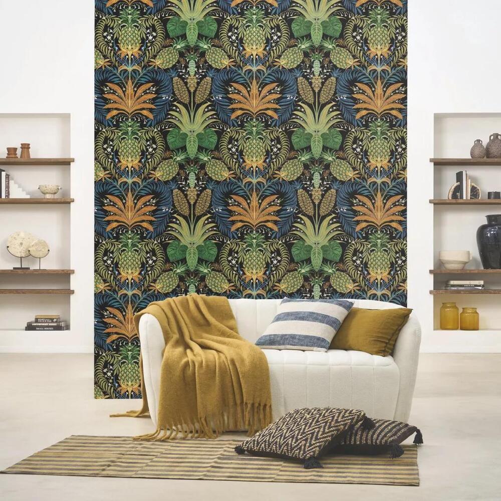 A trópusi ananász mintás tapéta különleges és dekoratív megjelenést biztosít a modern enteriőrökben. A részletgazdag botanikus minták, az ananász motívumok és a stilizált levelek egzotikus hangulatot teremtenek, miközben elegáns és karakteres faldekorációt biztosítanak.