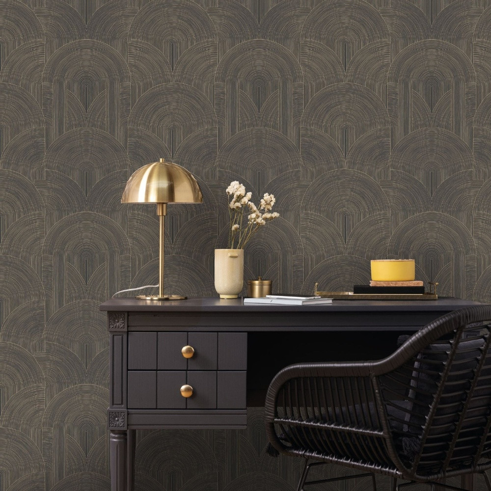 Ez az elegáns Art Deco stílusú geometrikus mintás tapéta modern és kifinomult megjelenést kölcsönöz a belső tereknek. A koncentrikus ívek és finom vonalstruktúrák különleges ritmust és dinamizmust visznek a faldekorációba.