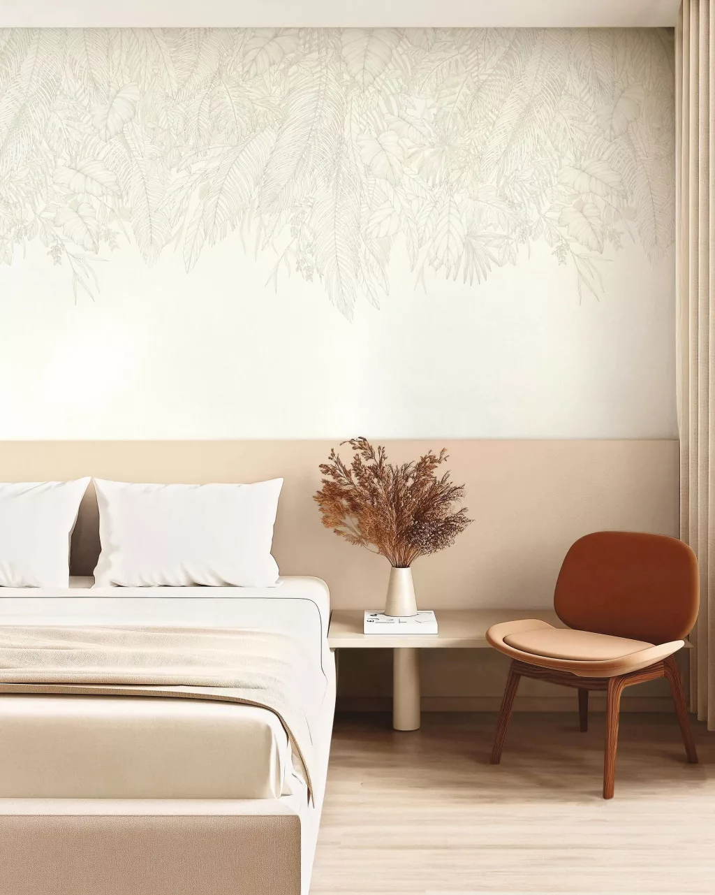 A trópusi növények elegáns grafikája egyedi karaktert ad a térnek, miközben nyugodt, harmonikus atmoszférát teremt.