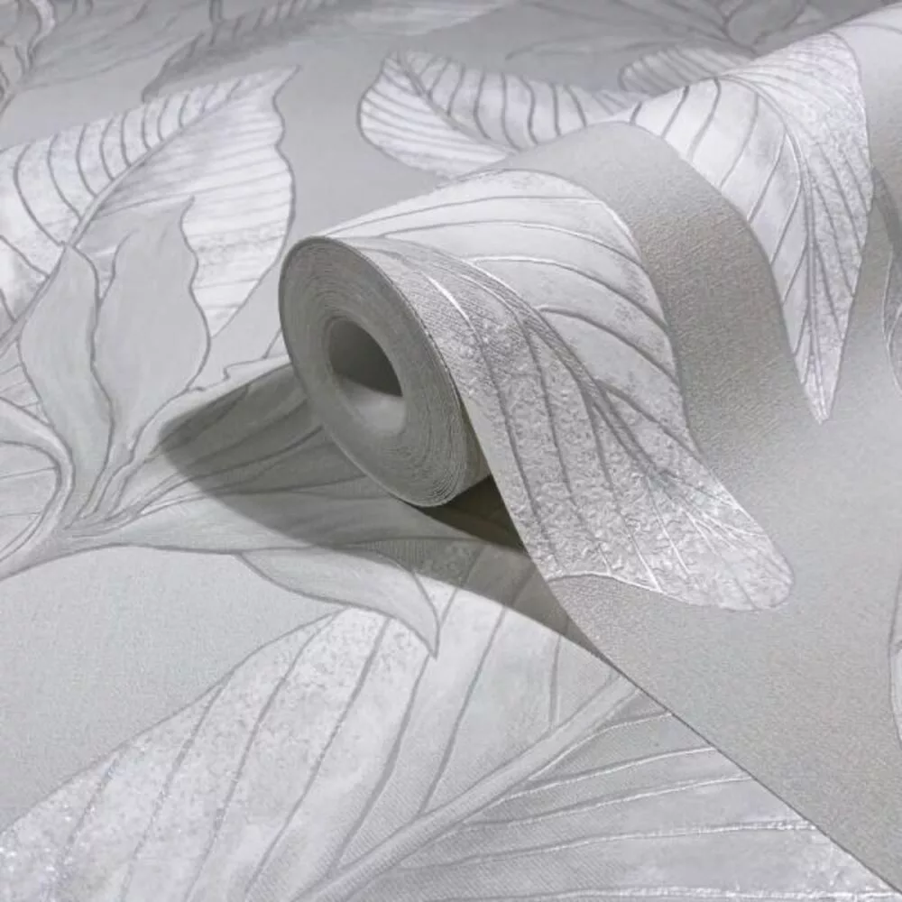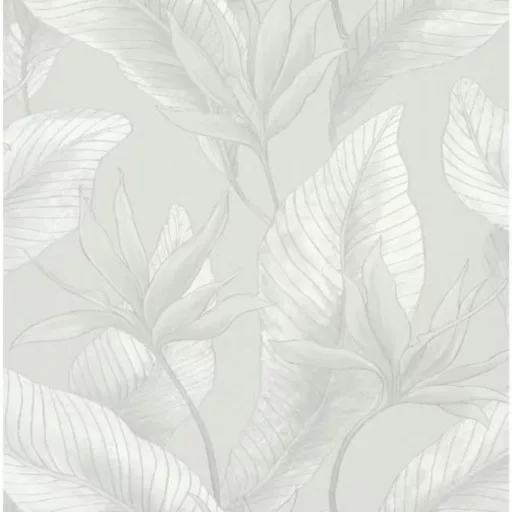 Letisztult, nagy levélmintás tapéta finom textúrával fehér,szürke kombinációval