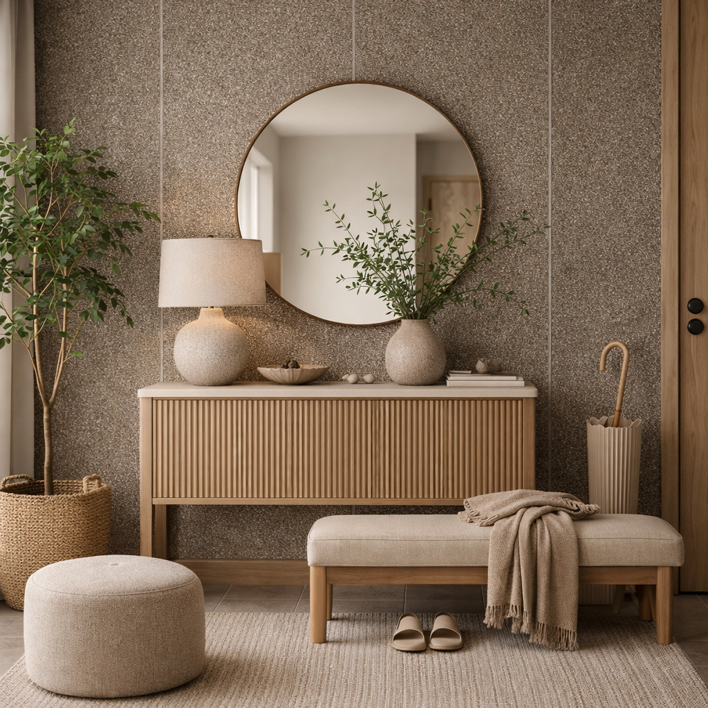A természet ihlette textúra meleg, földes tónusokkal párosul, így tökéletes választás modern, japandi, wabi-sabi vagy exkluzív minimalista enteriőrökbe. A szemcsés felület a fény hatására finoman életre kel, elegáns, luxus hangulatot teremtve.