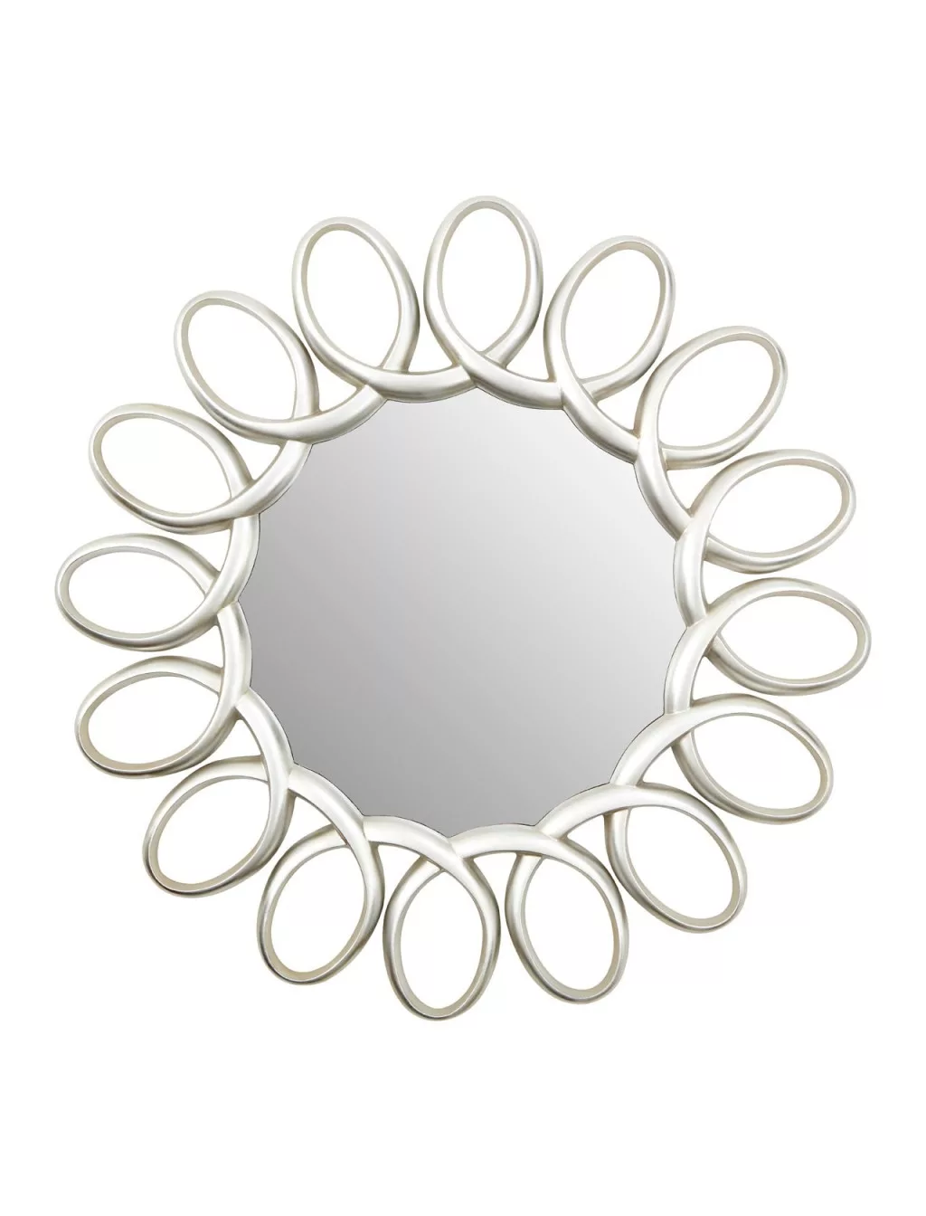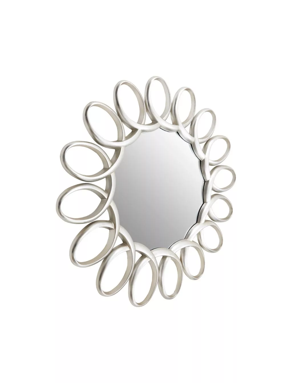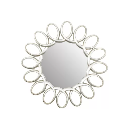 Dekoratív kerek tükör különleges, íves mintázatú kerettel. Légies, modern megjelenésű fali kiegészítő nappaliba, előszobába vagy hálószobába.