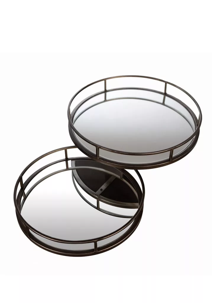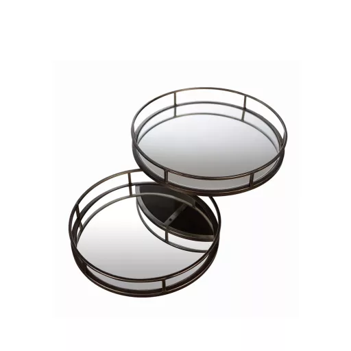 Elegáns, kerek dekor tálca szett modern fém kerettel és letisztult kialakítással. Tökéletes választás nappaliba, dohányzóasztalra vagy konzolasztalra stílusos tálaláshoz és dekorációhoz.