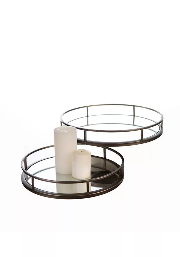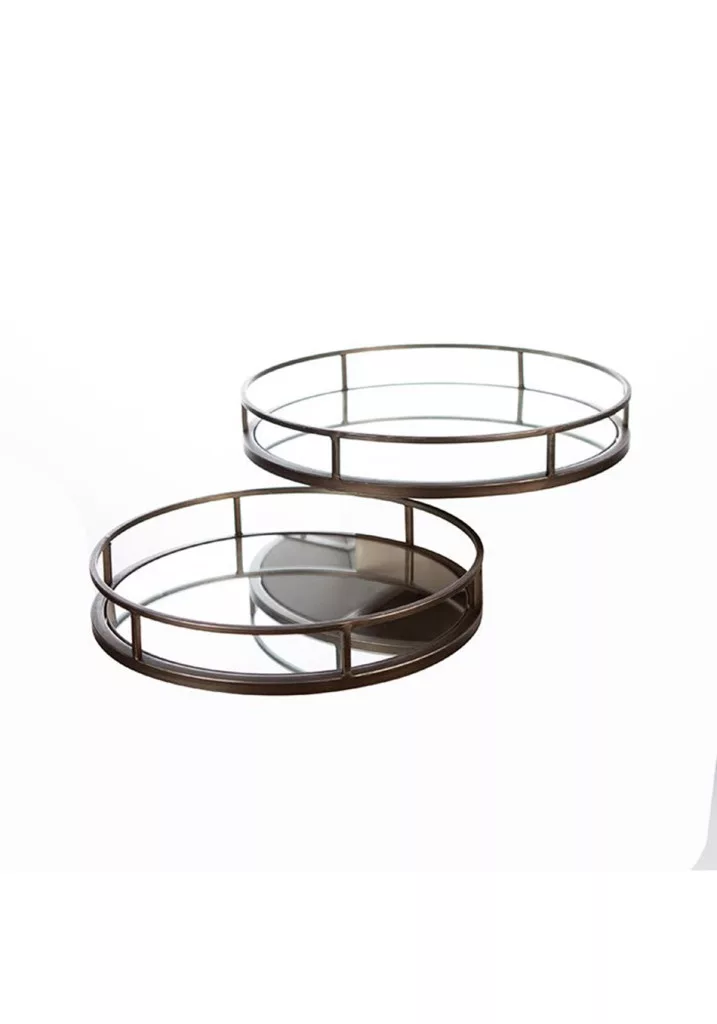 A két különböző méretű tálca sokoldalúan használható: ideális italok, kávéskészlet vagy dekorációs elemek rendezett és stílusos elhelyezésére. A magasított perem stabilitást ad, miközben a nyitott kialakítás modern, légies hatást kelt.