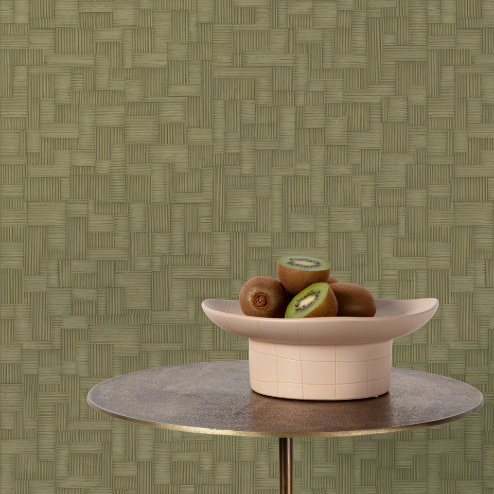 Elegáns szövött panelhatású tapéta geometrikus blokk mintázattal, olivazöld színben
