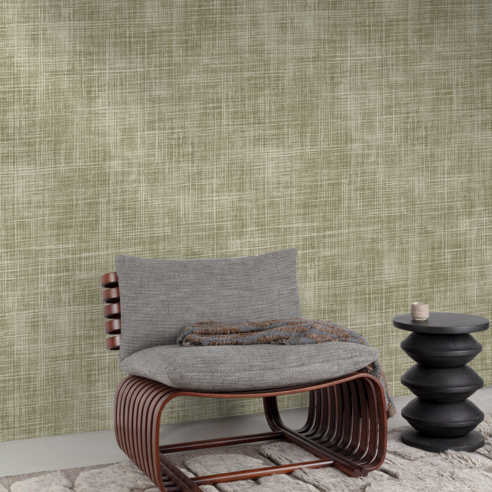 Elegáns, keresztszálas textilhatású tapéta finoman strukturált felülettel, zsályazöld színben