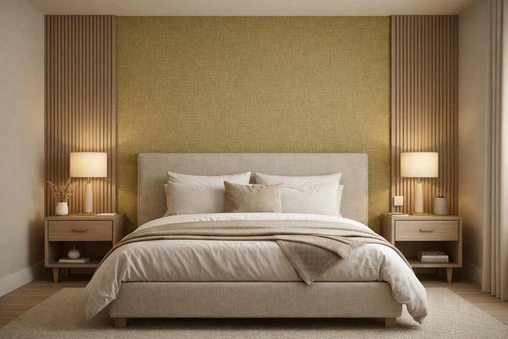 A textilhatású felület melegséget és prémium érzetet ad a térnek, miközben időtálló és elegáns megjelenést biztosít.