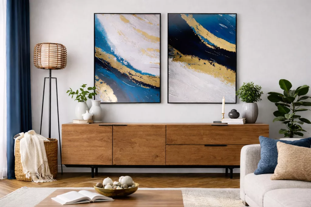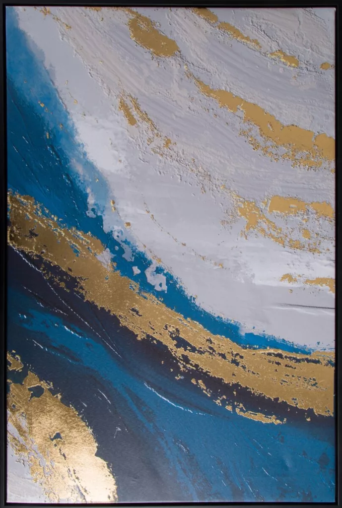Ez az elegáns absztrakt vászonkép a modern enteriőrök egyik legkarakteresebb dekorációs eleme. A mély sötétkék és grafitszürke árnyalatokat dinamikus arany ecsetvonások emelik ki, amelyek luxus, mégis letisztult megjelenést kölcsönöznek a térnek.