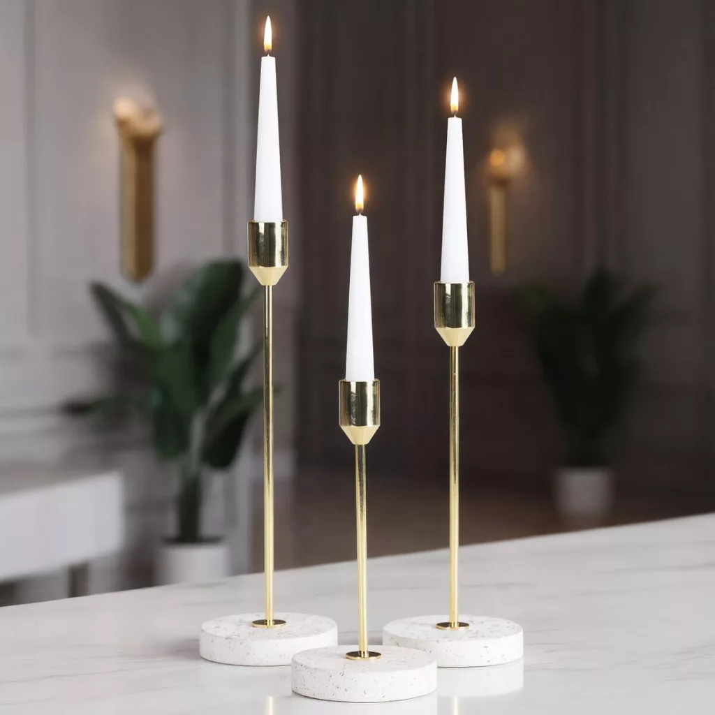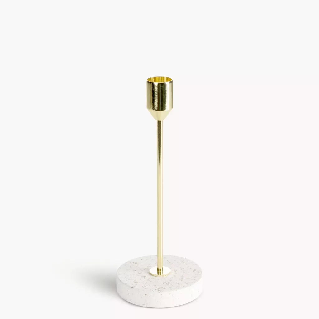 Ez a prémium megjelenésű gyertyatartó a modern elegancia tökéletes megtestesítője. A karcsú, arany színű fém szár és a márványhatású, világos talp időtálló luxus érzetet ad a térnek.