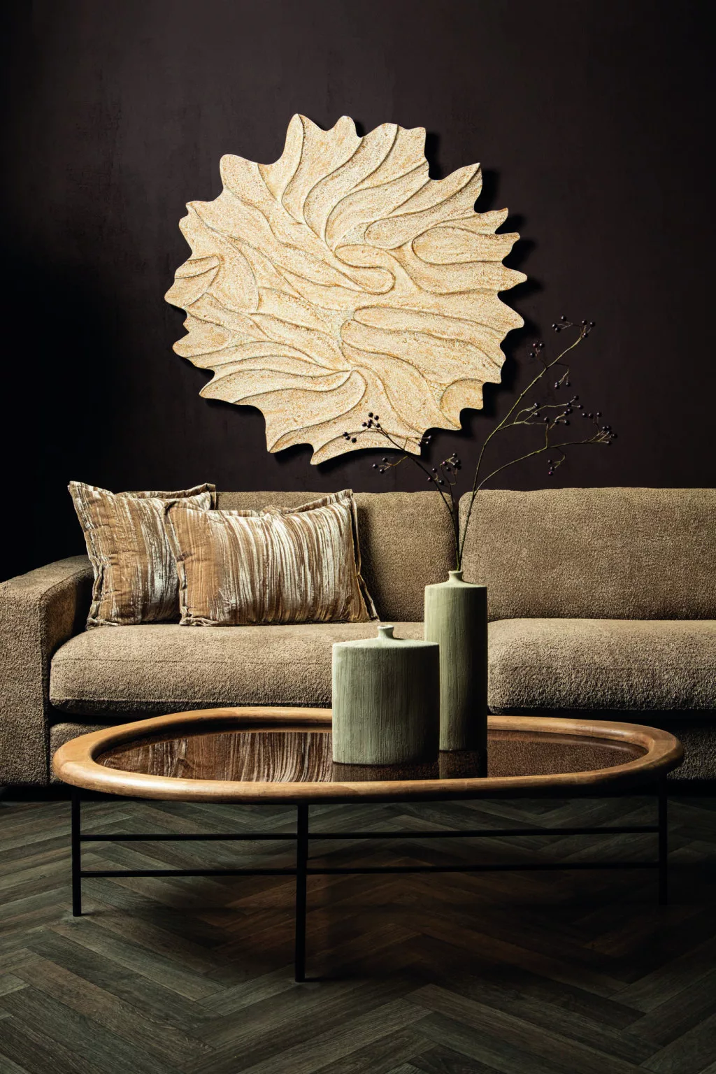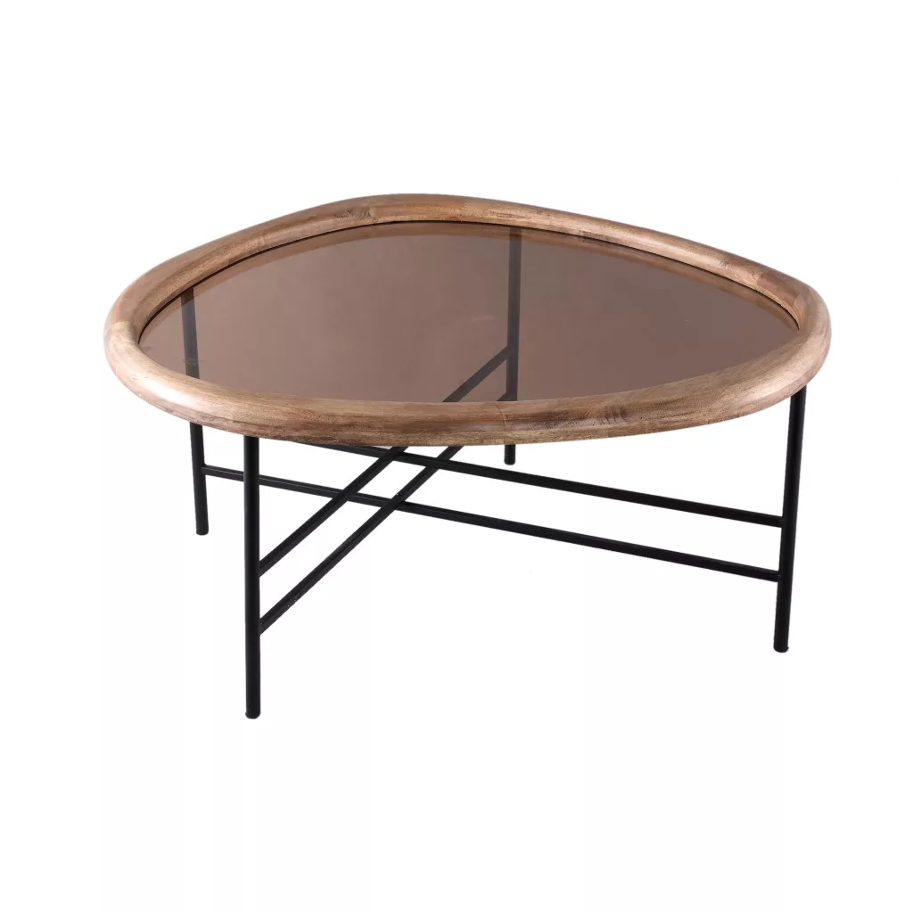 Ez a kerek dohányzóasztal természetes fa peremével és füstös üveglapjával meleg, mégis modern megjelenést ad a nappalinak.