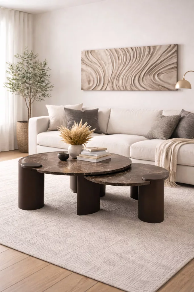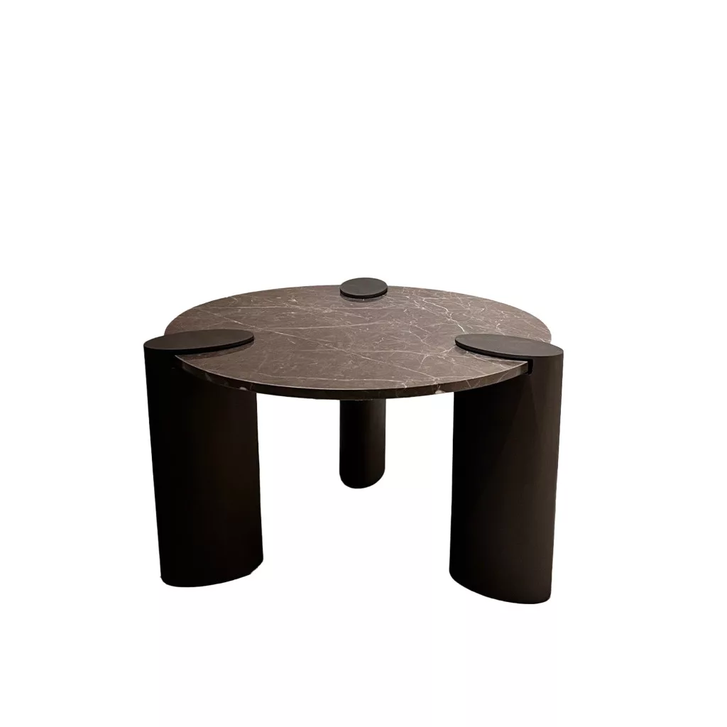 Ez a kerek design asztal sötét márvány asztallappal kifinomult, modern megjelenést kölcsönöz bármely enteriőrnek. A mély tónusú, finoman erezett lap elegáns kontrasztot alkot a letisztult, sötétbarna fém lábszerkezettel, miközben prémium hatást kelt. A kerek forma harmonikus térérzetet biztosít, így ideális választás nappaliba, étkezőbe vagy exkluzív lounge környezetbe. Időtálló design, amely tökéletesen illeszkedik modern, minimalista és luxus stílusú otthonokba.