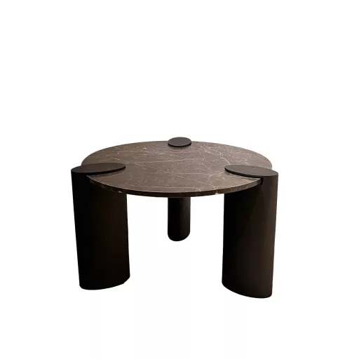 Kerek design asztal sötét márvány asztallappal és modern, sötétbarna fém lábszerkezettel. Elegáns központi elem nappaliba vagy étkezőbe.