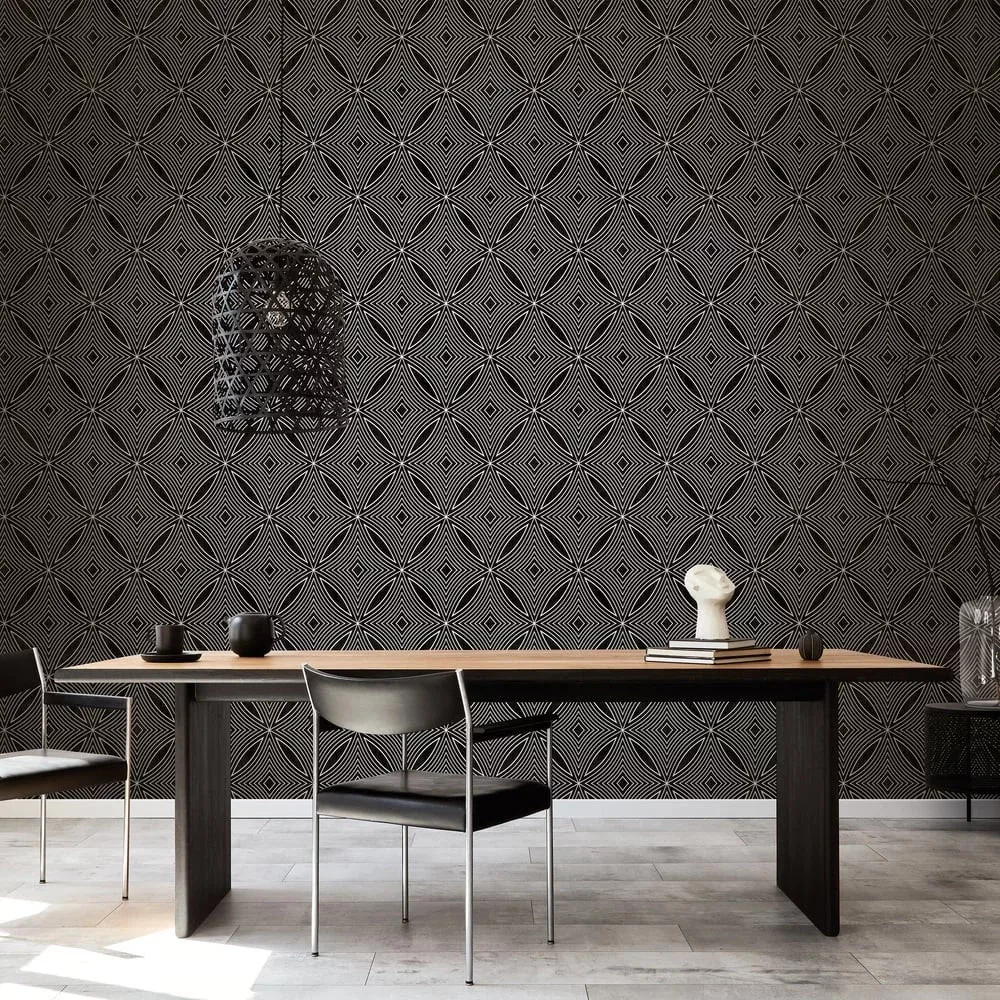 Modern geometrikus mintás prémium tapéta elegáns pasztell fekete alapon ezüst színü fémes felülettel