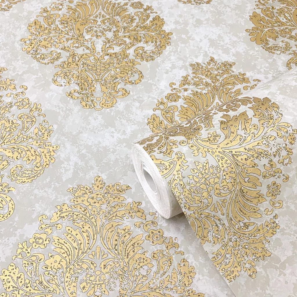 Prémium damaszt mintás tapéta – elegáns szürke-arany színben